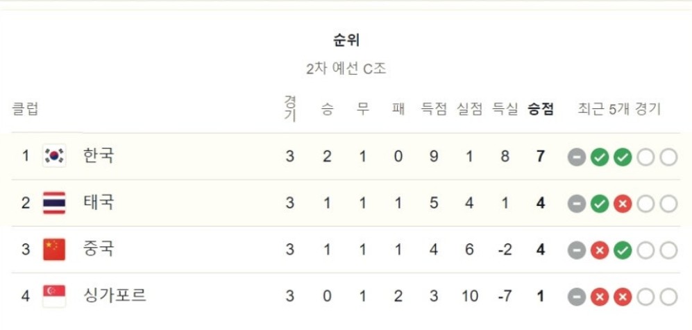 1차전 태국과 무승부를 하면서 현재 2승1무인 대한민국입니다. 2차전은 태국에서 하는원정이지만 승리가 유력시 되고 있습니다.